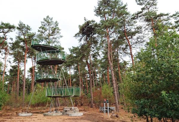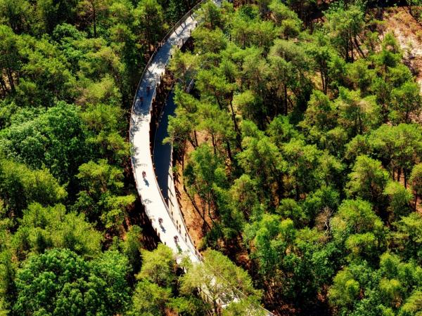 In Natuurgebied Bosland in Hechtel-Eksel vind je een bijzondere fietsbrug die je laat fietsen tussen de kruinen van de bomen. Een dubbele cirkel van 700 meter lang brengt je tot 10 meter hoogte.